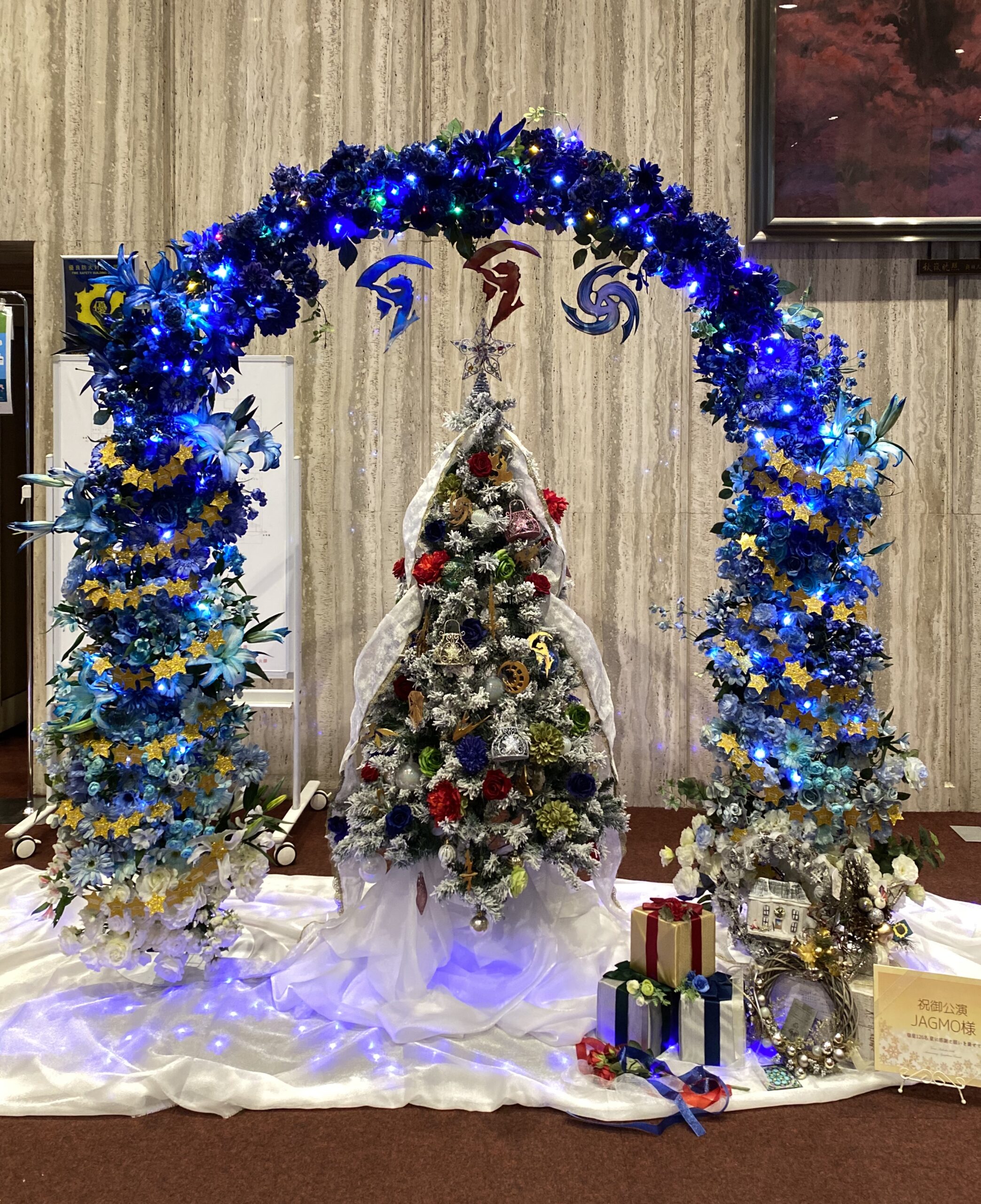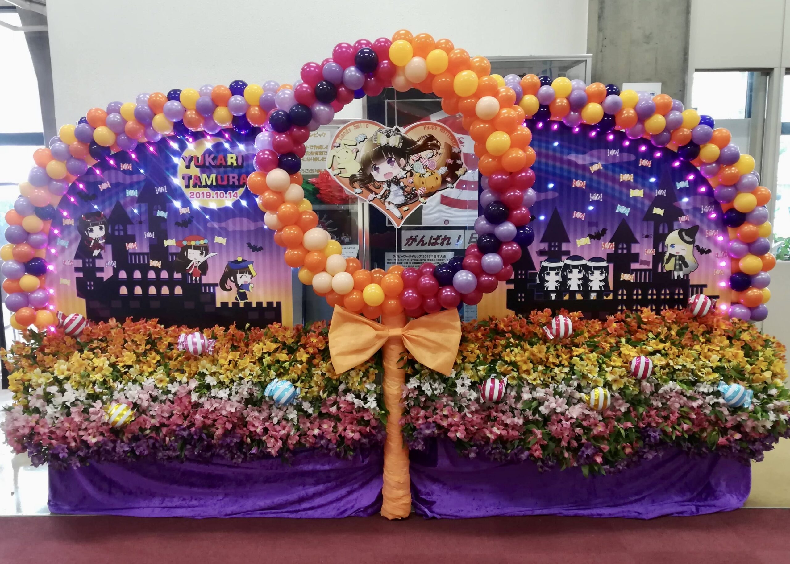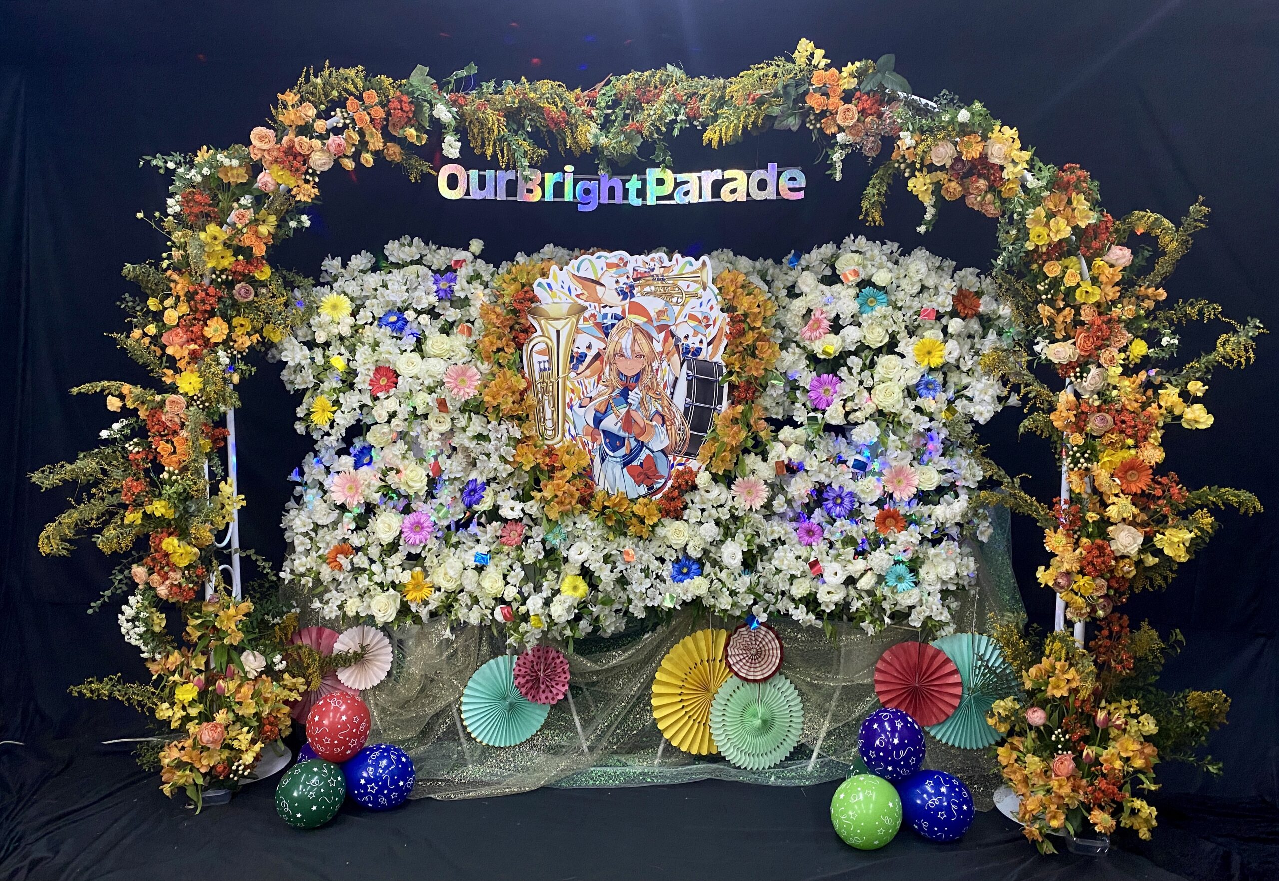 大型装飾の定義は難しいのですが、とにかく規模の大きいもの、フラスタを何基も連結して制作するもの、バルーンやアーチで会場全体を装飾するもの、そのようなイメージです。